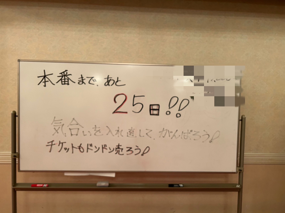 本番まで残り25日。(写真のモザイク部分はご想像にお任せします笑)稽古も大詰めです。そんな本日は第2回目の通し稽古でした。